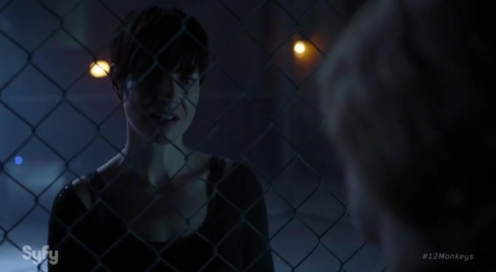 Nel 2046, invece, dopo aver forgiato un’inedita alleanza fondata sul comune desiderio di distruggere il Testimone, Ramse consegna Olivia agli uomini della Jones, la quale non trova niente di meglio da fare che rinchiuderla in una gabbia con tanto di rete elettrificata, per poi convertire la propria macchina del tempo in un inedito strumento di tortura, bloccando la donna in un loop continuo di disgregazione e ricomposizione, allo scopo di farle confessare tutto quello che sa a proposito del Testimone. 12 Monkeysnon ha mai nascosto il lato oscuro dei propri “eroi”, costretti a volte a compiere delle scelte eticamente condannabili per il bene della missione; e certamente poco condivisibile è la pratica della tortura, inflitta sia dalla Jones sia, in modalità differenti e molto più redditizie, da Cole, eppure è necessaria per strappare ad Olivia quelle informazioni necessarie per sconfiggere il Testimone. Nonostante il personaggio dell’ex-nemica si trovi in questo episodio ad affrontare una serie di situazioni e di stati d’animo differenti (passando dalla rabbia per essere stata usata dal Testimone e poi buttata via alla spavalderia e al sarcasmo con cui affronta i suoi aguzzini, dalla commozione nel ricordare la propria infanzia al cedimento finale in seguito alle torture subite) duole constatare come Alisen Down continui a offrire un’interpretazione monocorde, ripetitiva, inespressiva, limitandosi a qualche smorfia o a digrignare i denti quando deve trasmettere rabbia o dolore.