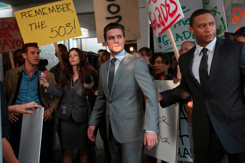 Se c’è una cosa che gli autori di questa serie tv sanno far bene sono i cliffhanger: strategici colpi di scena, strategicamente piazzati sul finale di episodio. Il risultato è ovviamente quello per cui loro, machiavelliche menti masochistiche (spesso geniali), lavorano molto accuratamente, sperando di lasciarci a bocca aperta e con l’ansia di vedere cosa accadrà nella puntata successiva. Anche questa volta direi che hanno fatto centro. Infatti, complice l’ormai antipatica Laurel, il Vigilante si ritrova circondato da decine di uomini armati e con tanti puntini rossi sul petto; ci troviamo di fronte ad un errore di Oliver causato dal suo cuore e dal suo desiderio, in fondo, di non apparire agli occhi della sua Laurel come un assassino. Ovviamente siamo solo alla seconda puntata, e quindi direi che alla fine in qualche modo Green Arrow fuggirà dalle mani della giustizia.