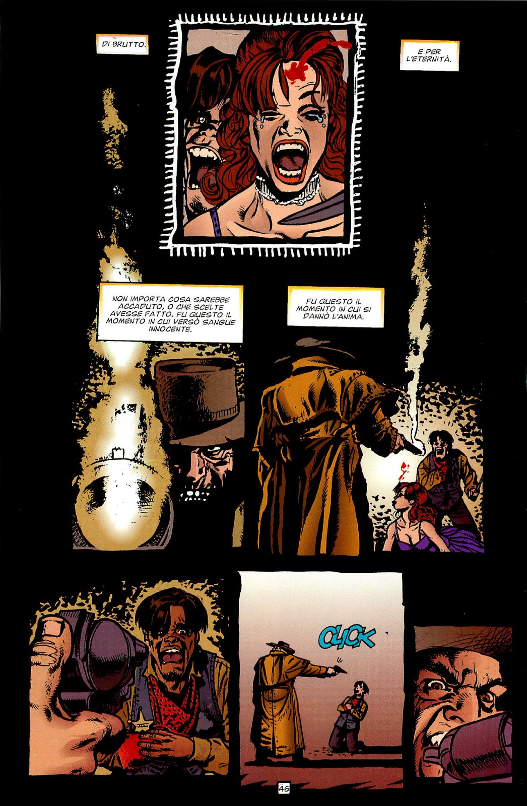 28) Vengono svelate le origini del Santo Degli Assassini, che qui però sembrano essere parecchio rivisitate. Nel fumetto Il Santo era un soldato confederato durante la guerra di secessione americana, distintosi per la sua ferocia in battaglia. Dopo la guerra divenne un pistolero e cacciatore di taglie fino a quando non salvò una donna di cui si innamorò, pose fine alla sua vita fatta di violenza e i due si sposarono e figliarono. Un giorno la moglie e la figlia si ammalarono e il Santo raggiunse la città per comprare le medicine necessarie. Sulla strada del ritorno fu rallentato da una banda di fuorilegge e quando ritornò a casa le due erano già morte.