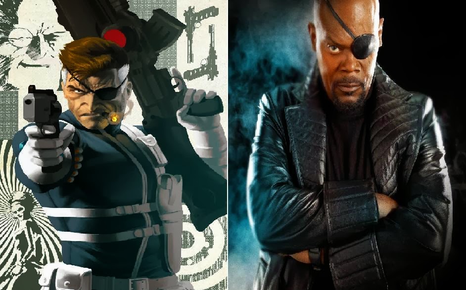 Rispetto alla signorina di cui sopra, il capoccia dello S.H.I.E.L.D. ha parecchie cose non in comune con la versione originale. Nel UMC, Nick Fury è un veterano della Seconda Guerra Mondiale, capo degli Howling Commandos e grande amico di Dum Dum Dugan e Capitan America. Infatti, dopo la fine della guerra, fonderà lo S.H.I.E.L.D. proprio per portare avanti gli ideali di Cap e (sempre ispirandosi a lui) userà un acronimo fatto in modo che possa avere l’equivalente della parola Inglese “Shield” che significa “Scudo”, arma usata dalla Sentinella della Libertà sia come difesa ma anche come attacco; l’idea dello S.H.I.E.L.D. è proprio questa, un’organizzazione pronta a difendere il mondo, ma anche ad attaccarlo ed eliminare potenti minacce, se necessario. E’ caucasico, ha una benda su un occhio mancante riportata dopo una missione e ha i capelli castani con folte basette bianche, possiede inoltre il grado militare di Colonnello; il segreto della sua giovinezza non è mangiare al Subway ma l’essersi iniettato una variante del Siero del Super Soldato (chiamato “Infinite Formula”) che rallenta l’invecchiamento e dona capacità fisiche olimpioniche. Invece, nell’UCM, di Nick Fury non si sa praticamente niente, ma le sue origini (si vocifera) saranno rivelate in Capitan America: Winter Soldier, il sequel di Il Primo Vendicatore. Le uniche cose che si sanno, è la lampante e palese differenza fisica e il fatto che, per questa versione cinematografica, i produttori si siano ispirati alla versione Ultimate creata per la serie a fumetti “Ultimates” dove (i creatori di tale serie) si sono ispirati a Samuel L. Jackson per il volto di Fury; la serie citata risale a 6 anni prima della prima apparizione di Jackson come Fury.