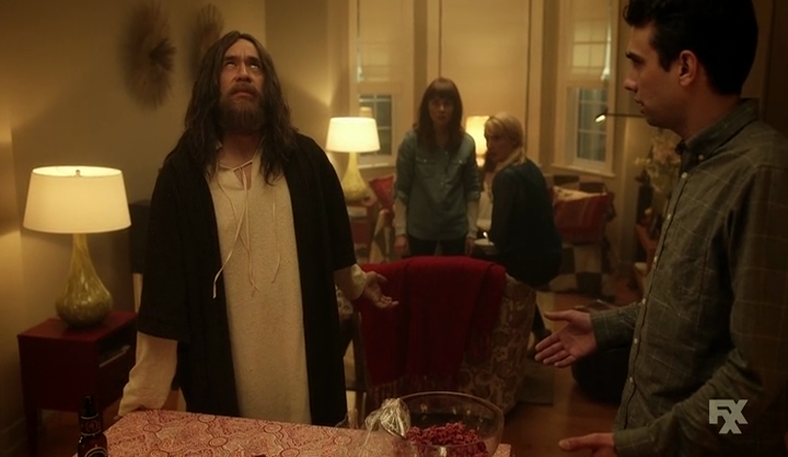 Nella seconda parte, poi, l’analogia passa all’eccentricità pura, l’esagerazione improbabile e allegorica colta in un contesto verosimile, lo stadio massimo dello spirito della serie. Se nel Pilota, infatti, avevamo nientepopodimeno che Adolf Hitler ad impersonare il classico nuovo “boyfriend” della nostra ex-ragazza, stavolta, piuttosto in netta contrapposizione (per usare un ardito eufemismo), il “rivale in amore” col quale dobbiamo fronteggiarne il paragone ha i panni di Gesù Cristo, Figlio di Dio e, ai tempi nostri, alla stregua di una “scomoda” celebrità. Anche qui, l’idea non può dirsi del tutto originale, ricordando il precedente made by Seth McFarlane in un indimenticabile episodio dei Griffin, eppure lo diventa sia con la pacata e irresistibile interpretazione di Fred Armisen (per la gioia di quelle 3 persone che hanno visto Documentary Now!), sia con la trovata di renderlo celiaco, rovesciando inoltre la sua aura da “schizzinoso” di quando ancora non ne conoscevamo l’identità,