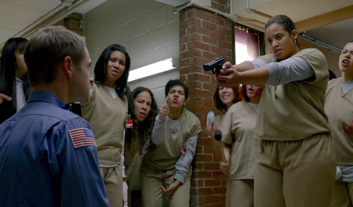 Già solo la scena iniziale di “Riot FOMO” basterebbe per riassumere tutto il senso di questo episodio. Si viene immediatamente catapultati in una situazione violenta ma grottesca, con una detenuta che punta un’arma da fuoco contro una guardia, accerchiata da altre detenute che le urlano consigli di tutti i tipi, mentre alcune di queste si preoccupano se gli eventuali schizzi di sangue potrebbero macchiarle i vestiti. Dal punto di vista narrativo, raramente si era vista una continuità così stretta e istantanea tra una stagione di una serie tv e un’altra; forse solo con Breaking Bad, considerando perlomeno l’ultimo decennio televisivo americano. Ma è soprattutto dal punto di vista della fruizione che l’intera sequenza acquista il suo maggior valore. Gli autori, infatti, non hanno alcun desiderio di accompagnare lo spettatore a rientrare, pian piano, nei meccanismi della serie, a ri-immedesimarsi nella storia, anzi tutto il contrario. Il pubblico viene catapultato subito al centro dell’azione, come se l’anno appena passato non fosse mai trascorso. Questo anche perchè, nell’era Netflix e, più in generale, in quella dello streaming in rete, è ormai possibile recuperare in men che non si dica l’episodio finale della stagione precedente, così da poter facilmente fare mente locale riguardo il consueto “dove eravamo rimasti”.