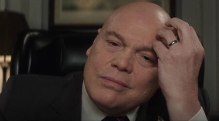 Wilson Fisk: “Thank you, New York. Vanessa and I, we offer our deepest regards. It’s humbling to be sitting here, speaking to you as mayor this evening. Beginning of the new year, and most importantly, a new era for the greatest city in the world. This city is in shambles. Crime, poverty, a feeling of uneasiness, as if any moment, things could explode. But New Yorkers are tough. We know how to take care of ourselves. We don’t need a gun-toting vigilantewho wears a skull on his chest or a man who dresses in a spider outfit. Or a guy who wears devil horns to save us. No.
