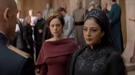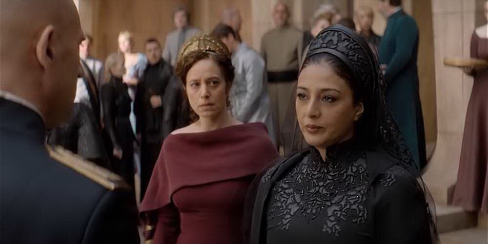 Un po’ perché l’attrice che la interpreta, Tabu, è un’affascinante stella di Bollywood, un po’ perché il personaggio usa le arti della Sorellanza, l’imperatore inizia subito a farle le fusa. C’è di mezzo anche l’imprinting, quello delle paperelle di Konrad Lorenz. L’imperatrice, come si vede nell’immagine, non gradisce per nulla e il terzetto dà vita ad un gustoso momento di tv bene interpretato.