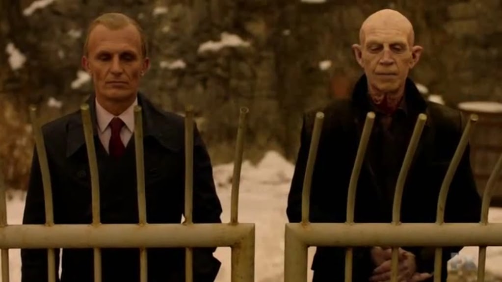 Il fittizio spot pubblicitario della Partnership, ancora più delle sequenze iniziali che vedono protagonista un Ephraim Goodweather ormai trapiantato a Philadelphia, fornisce subito le informazioni necessarie a inquadrare la nuova situazione: gli strigoi, ormai liberi di muoversi per strada a qualsiasi ora del giorno grazie alla nube nucleare che oscura il Sole, hanno imposto all’umanità (o quantomeno agli Stati Uniti, non si sa ancora quale sia la situazione nelle altre nazioni) la propria dominazione e si servono di un’associazione sanitaria, la Partnership appunto, per rifornirsi di sangue umano. E’ una situazione apparentemente win-win, in cui tutti guadagnano qualcosa: gli umani rimangono in vita e guadagnano anche assistenza sanitaria gratuita in cambio delle donazioni di sangue (altro che Obamacare!), gli strigoi si riforniscono di cibo senza fatica, evitano di sterminare inutilmente la loro fonte di sostentamento e nel contempo di aumentare il proprio numero fino a livelli insostenibili. Certo, ci sarebbe quella piccola quisquilia della perdita della libertà, ma cosa volete che importi?