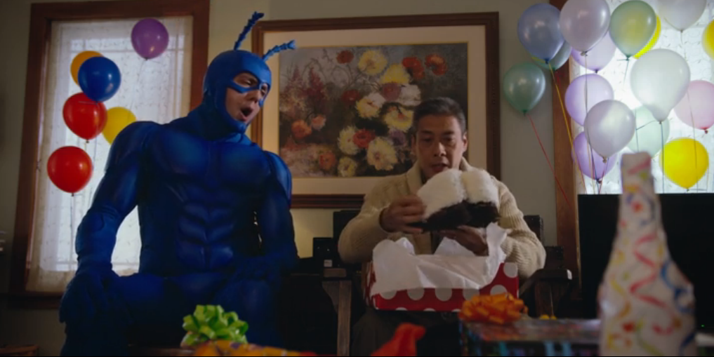 Meritano una menzione, infine, altri due piccoli e apparentemente insulsi dettagli della festa di compleanno di Walter: uno dei regali da lui scartati è un libro scritto da un cane, e subito dopo al telegiornale è riportata la notizia dell’apparizione di un gigantesco omone alto duecento piedi che si aggira completamente nudo (con tanto di censura coi pixel sfocati, questa è Amazon, non Starz!). Non saranno due momenti particolarmente divertenti e non avranno forse la minima utilità ai fini della narrazione (o magari sì, chi lo sa), ma fanno capire bene come ad essere assurdi non siano solo i singoli personaggi di The Tick, ma anche l’intero mondo in cui essi vivono e si muovono e quanto questa assurdità (tale dal punto di vista dello spettatore) sia percepita da loro come qualcosa di assolutamente normale. Del resto, in un mondo in cui i supereroi sono realtà, cosa volete che siano cani scrittori e giganti ignudi?