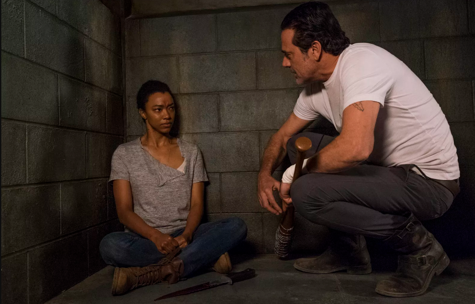 Negan: “This knife is yours now. You can try to use it, take me out, but considering I am standing above you, holding a baseball bat, that doesn’t seem real smart. Now, you can use it to slit your wrists, which would be a damn shame, but I get it. You’re obviously not on the shiny side of the street, given recent events. Now, you can sit there and do nothin’, wait for ol’ David to come back to life and eat your face, also a damn shame and kinda nuts, but, hell, to each their own. Or you can use that blade and stop ol’ Rapey Davey from becoming Dead-Alive Rapey Davey, save yourself, join the cause.