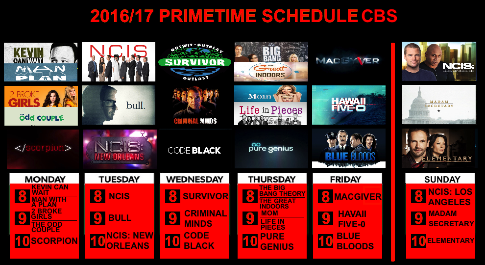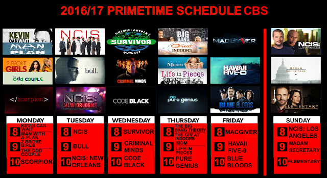 Serie rinnovate: 2 Broke Girls (Stagione 6), Blue Bloods (Stagione 7), Code Black (Stagione 2), Criminal Minds (Stagione 13), Criminal Minds: Beyond Borders (Stagione 2), Elementary (Stagione 5), Hawaii Five-0 (Stagione 7), Life In Pieces (Stagione 2), Madam Secretary (Stagione 2), Mom (Stagione 4), NCIS (Stagione 14), NCIS: Los Angeles (Stagione 8), Scorpion (Stagione 2); Supergirl (Stagione 2 trasferita su The CW), The Big Bang Theory (Stagione 10), The Odd Couple (Stagione 3).