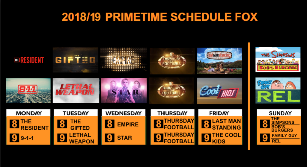 Serie rinnovate: 9-1-1 (Stagione 2), Empire (Stagione 5), Gotham (Stagione 5), Last Man Standing (Stagione 7), Lethal Weapon (Stagione 3), Star (Stagione 3), The Gifted (Stagione 2), The Orville (Stagione 2), The Resident (Stagione 2).